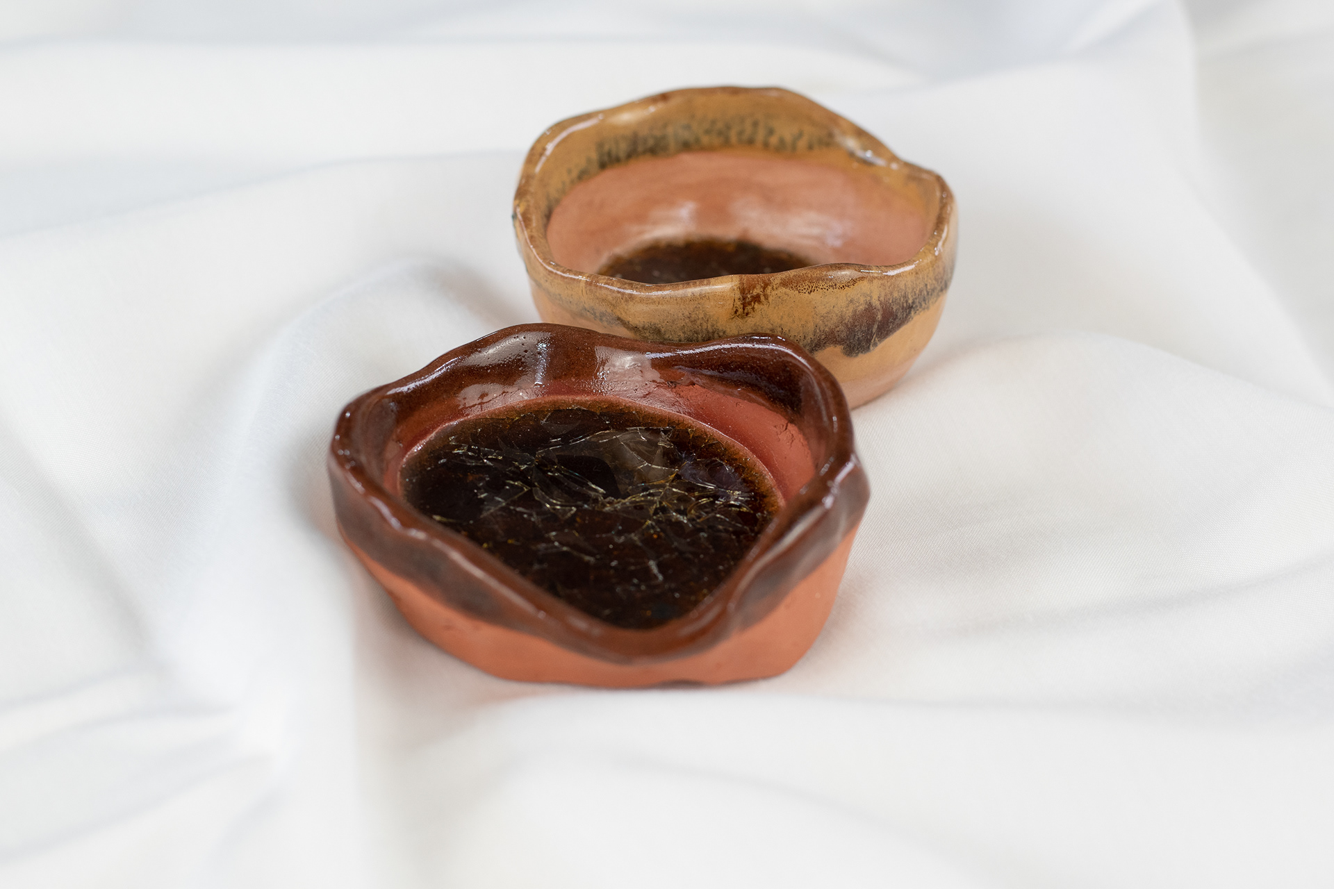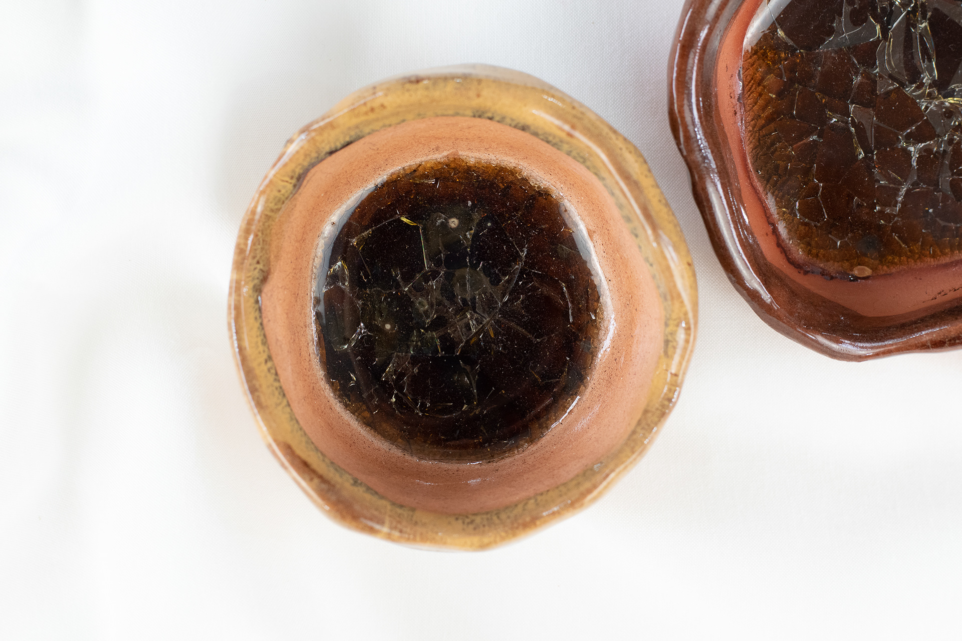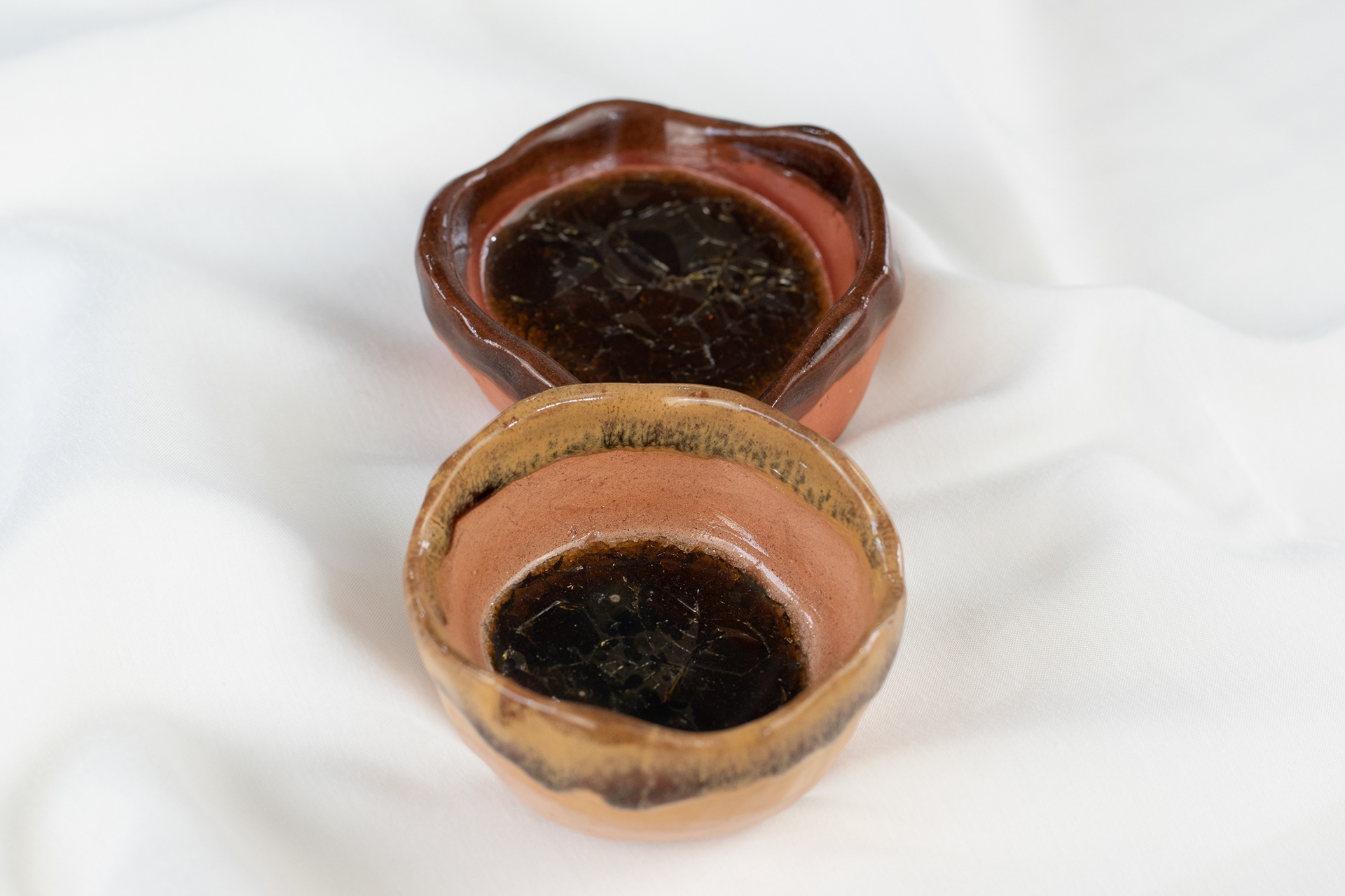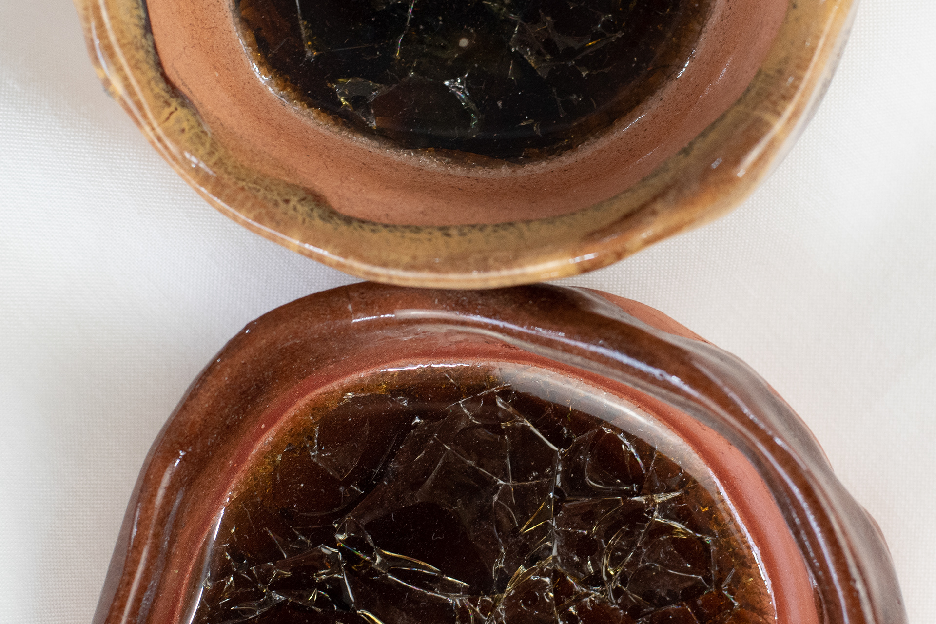 Dou em cerâmica creme e terracota, esmaltada e com aplicação de vidro com biqueima a 1000°C
