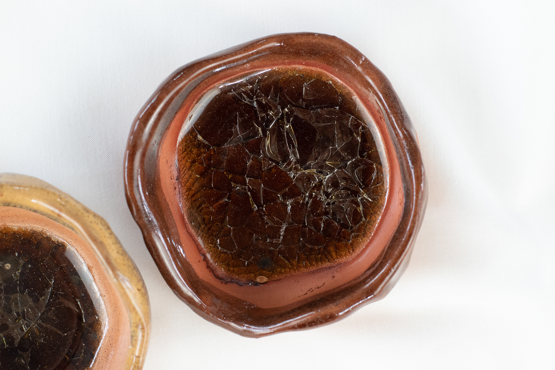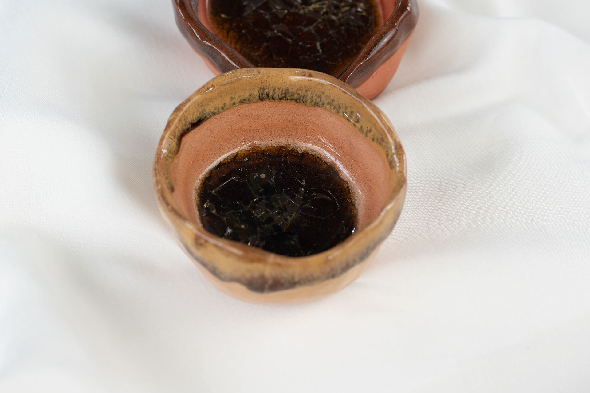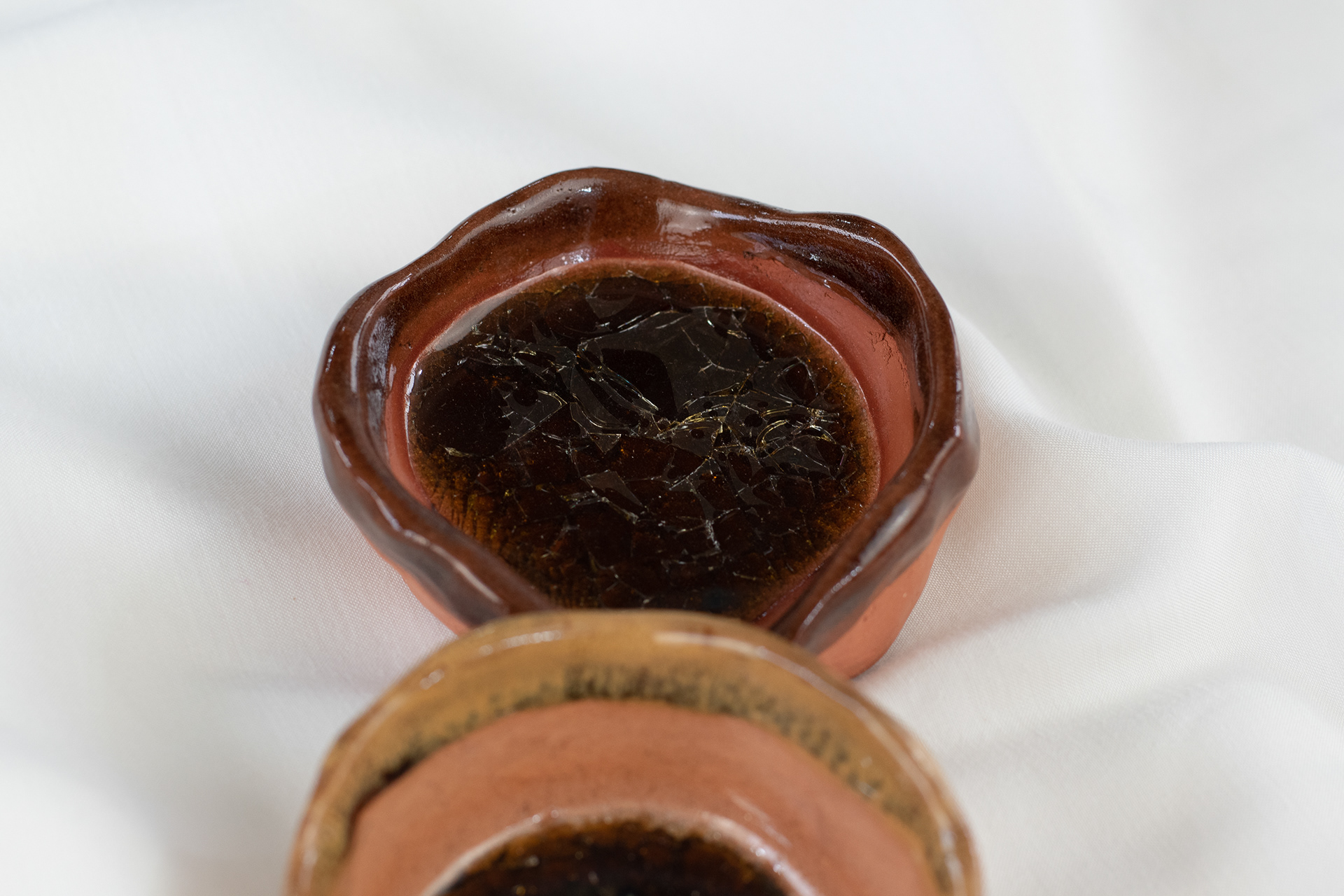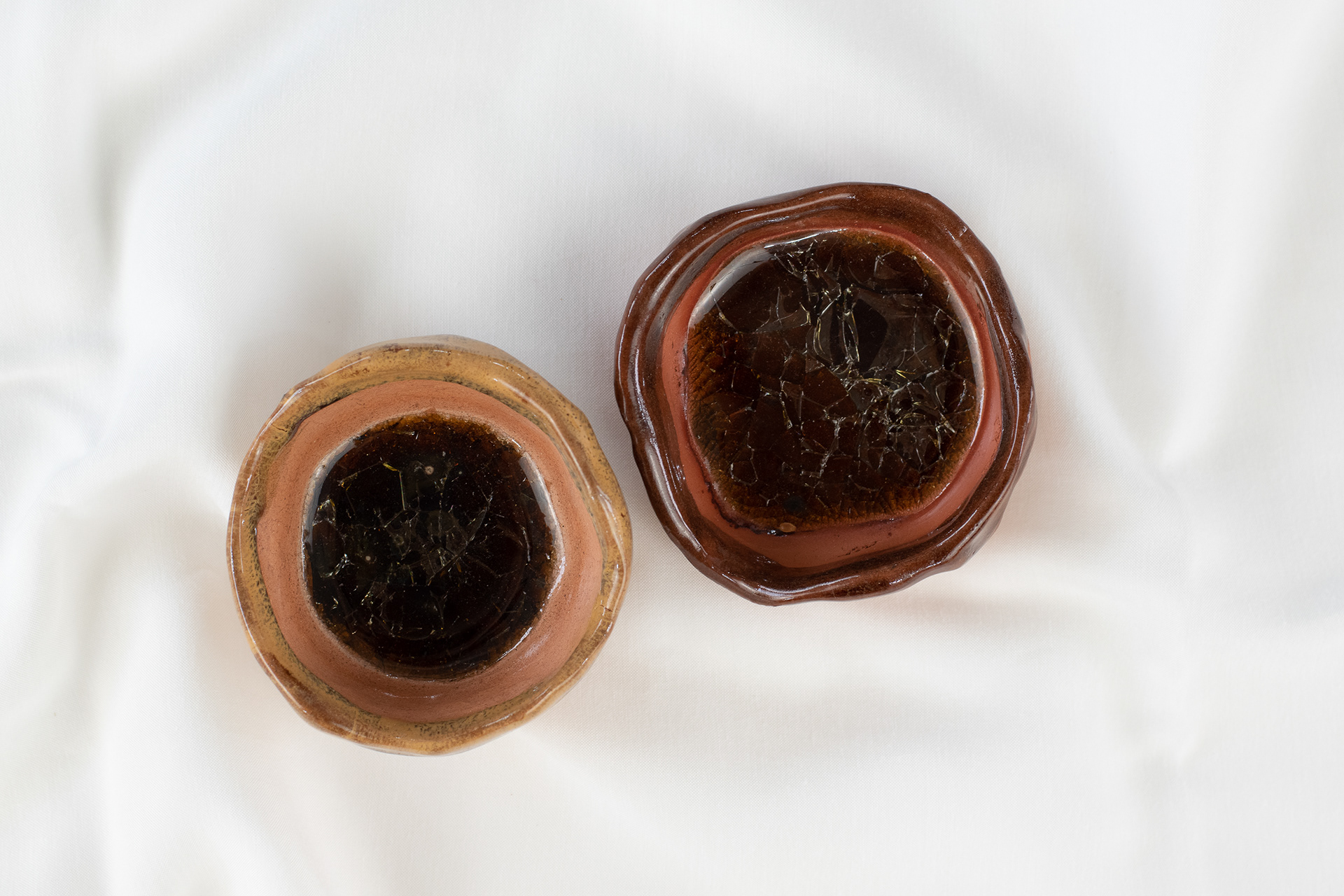 Dou em cerâmica creme e terracota, esmaltada e com aplicação de vidro com biqueima a 1000°C