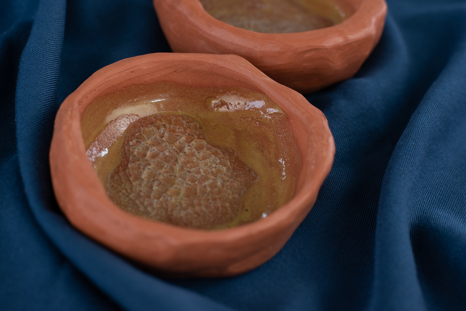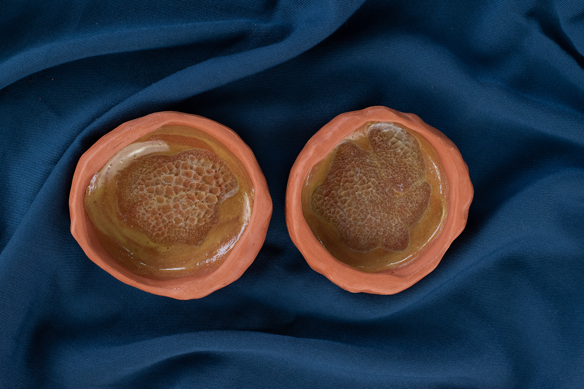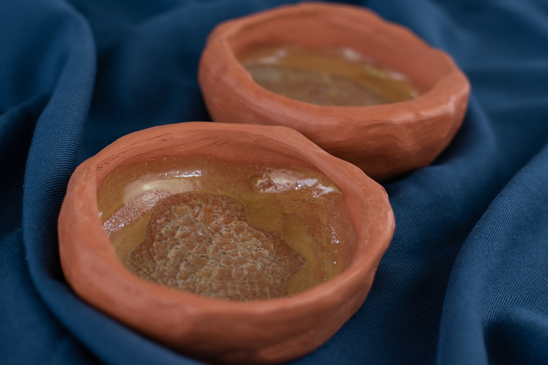 Cerâmica terracota brunida, com aplicação de vidro e esmalte, em biqueima a 1000°C