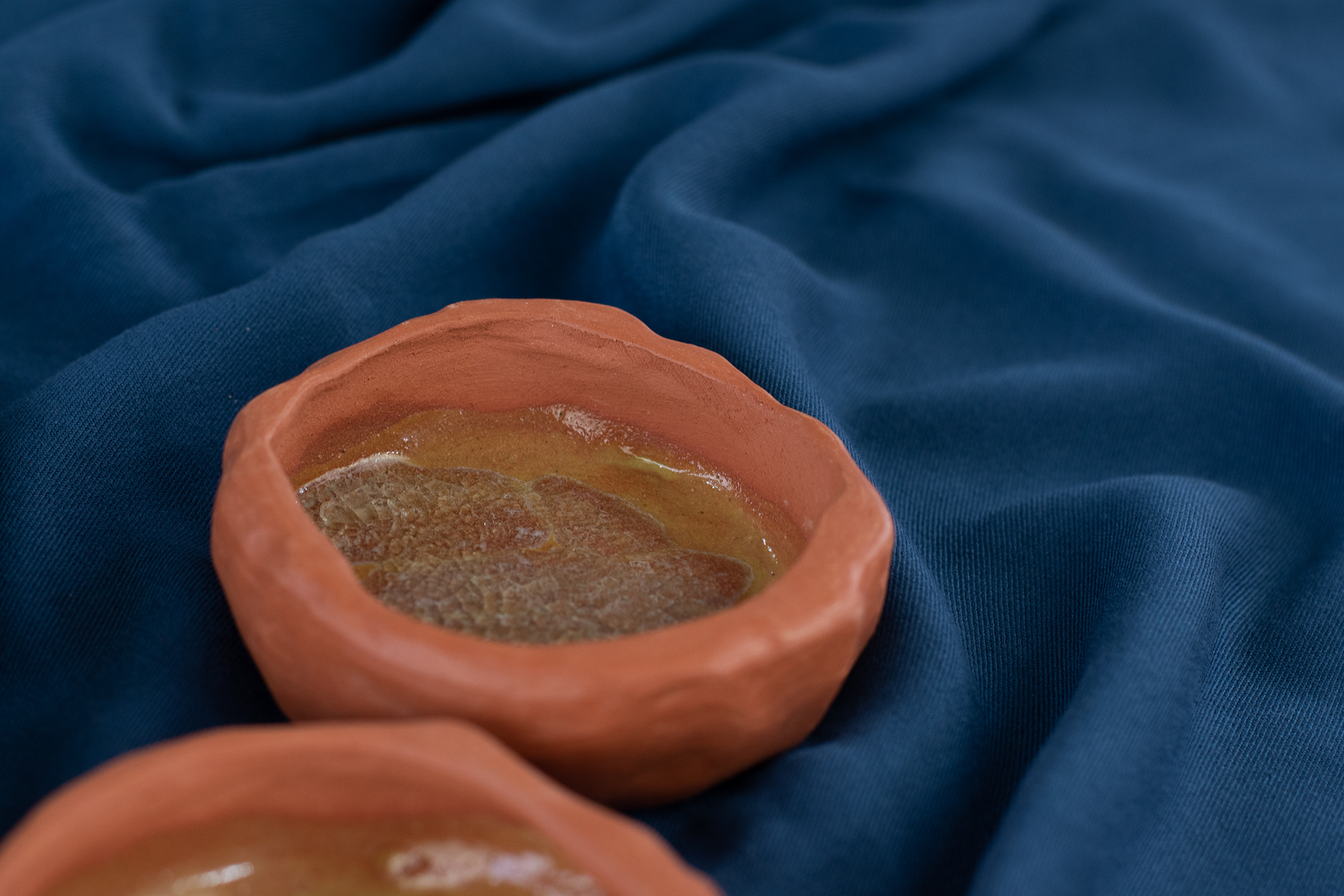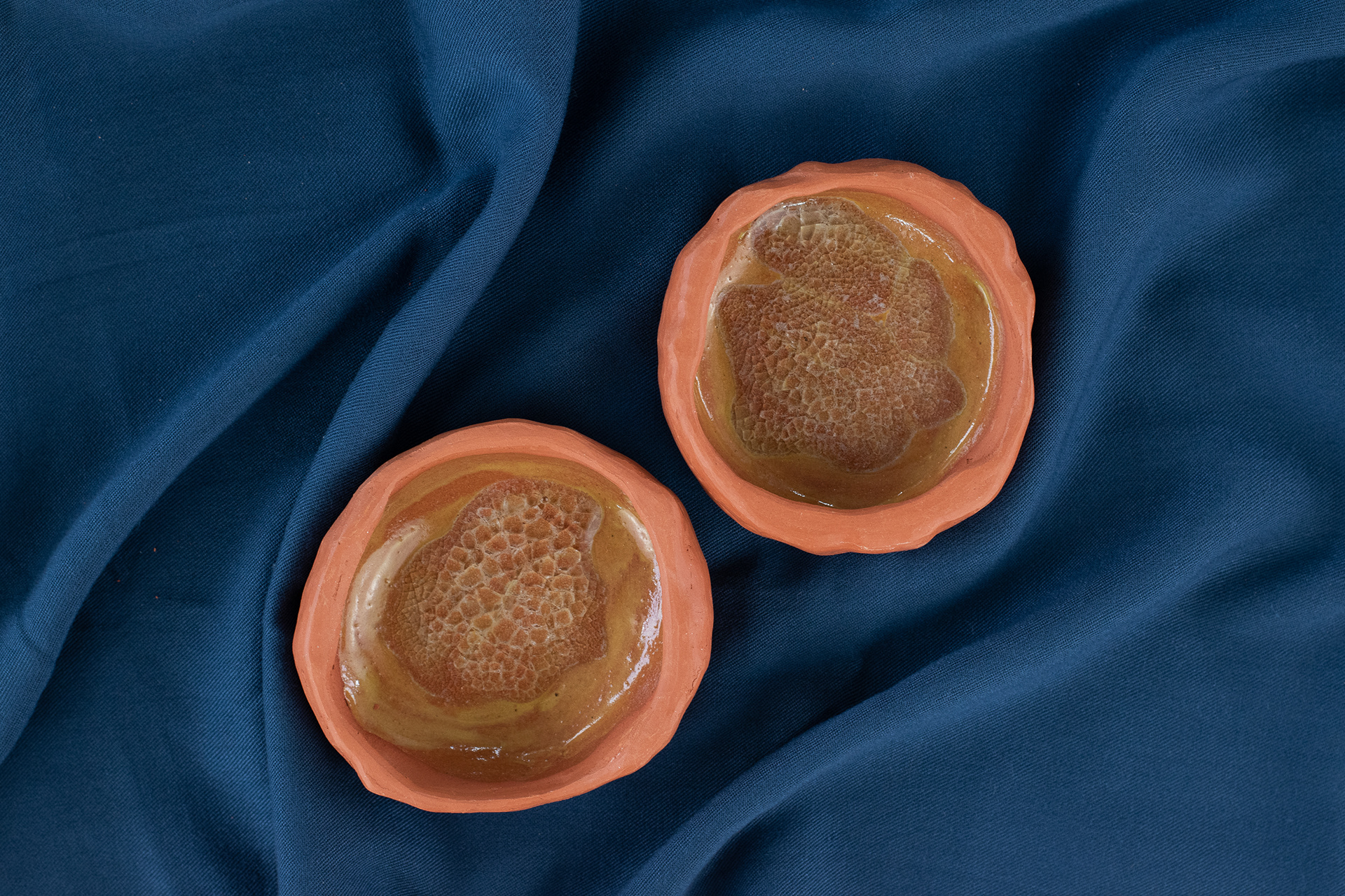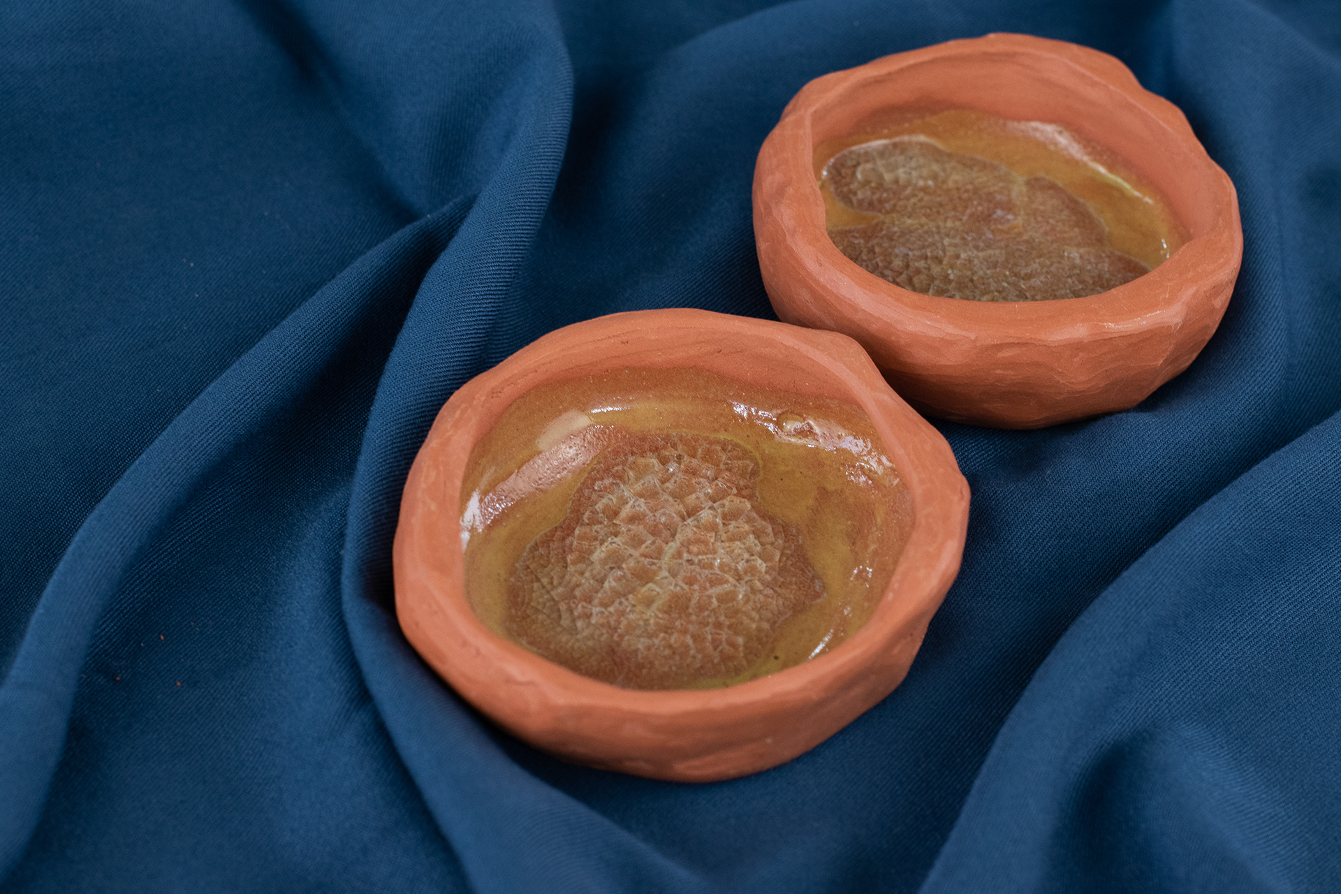 Cerâmica terracota brunida, com aplicação de vidro e esmalte, em biqueima a 1000°C