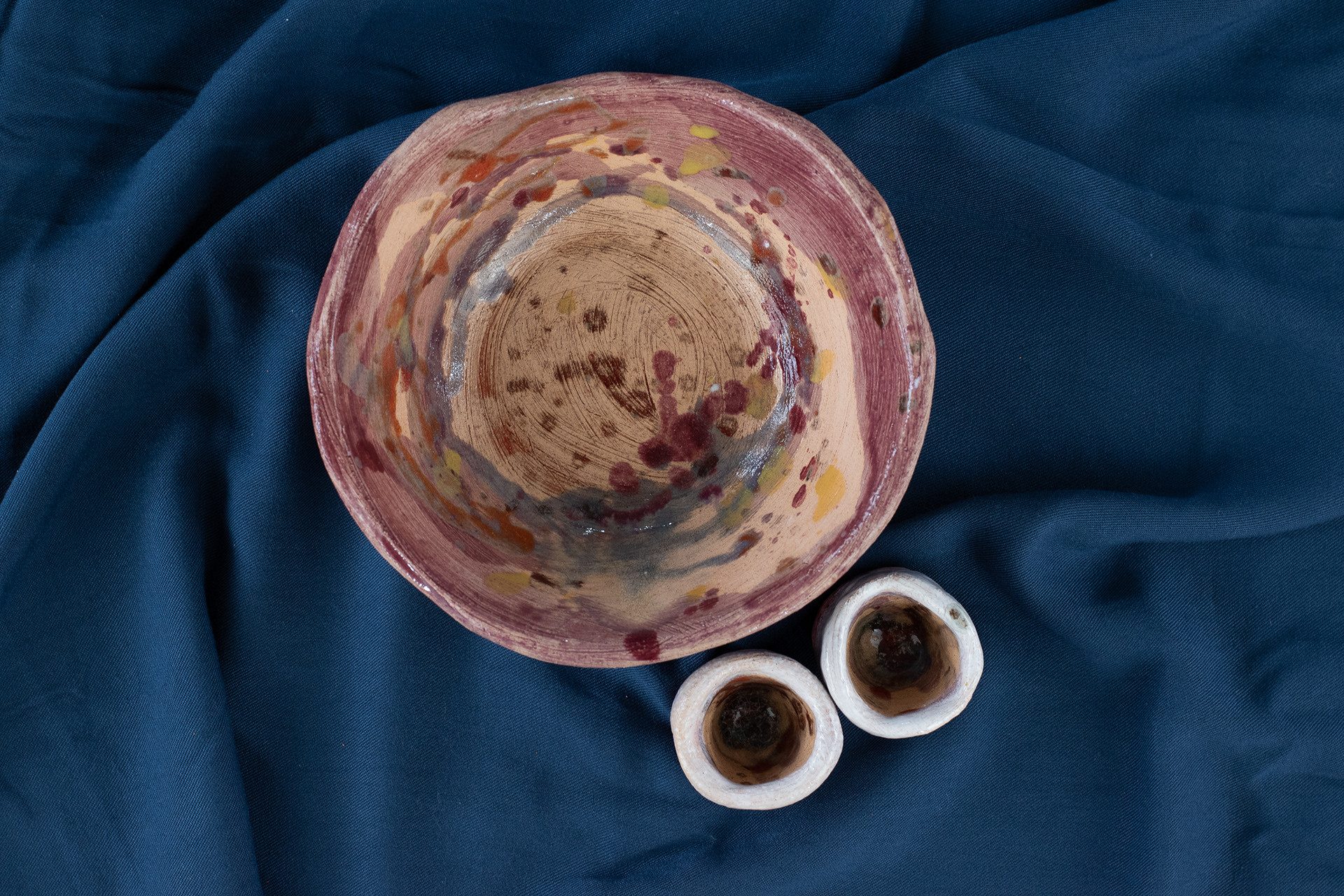 Kit petisqueira com dosinha, cerâmica marfim esmaltada, biqueima a 1000°C.